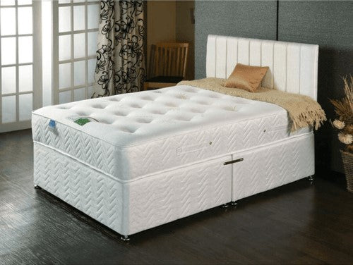 The mattress is an Aloe Vera Mattress containing environmentally friendly materials which are also excellent for your skin. After a long day of hard work and stress the aloe vera is the perfect mattress to sink in to, offering incredible quality of rest. It contains 1000 pocket springs which are enveloped in memory foam and layers of great quality filling
