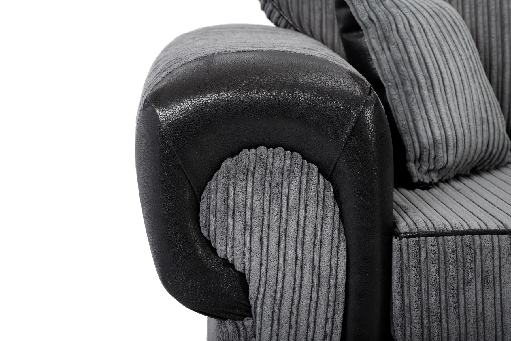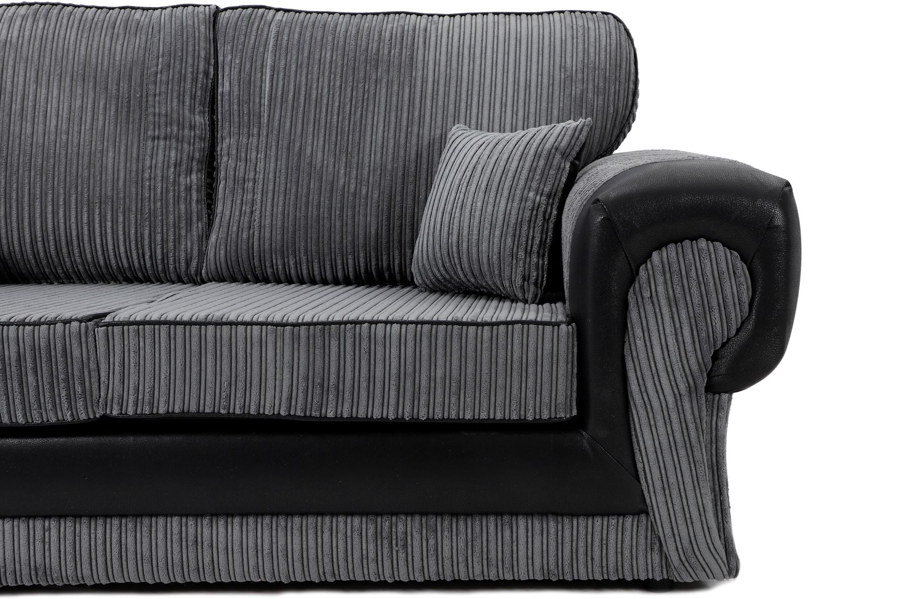 Stunning and incredibly comfortable, the Tangent range is made with a soft foam filled seat cushions. Available in three colours, black shimmer, silver shimmer and black/grey cord, the incredibly soft materials on this sofa provide excellent comfort. Complimented with the fibre filled back cushions to sink in to, makes this range super comfortable to relax on. The black faux leather when paired with the grey jumbo cord in this sofa collection makes the sofa really stand out creating an eye-catching look that perfectly fits into any interior design. This fantastic sofa range is certain to be a welcomed and stunning addition to your home.